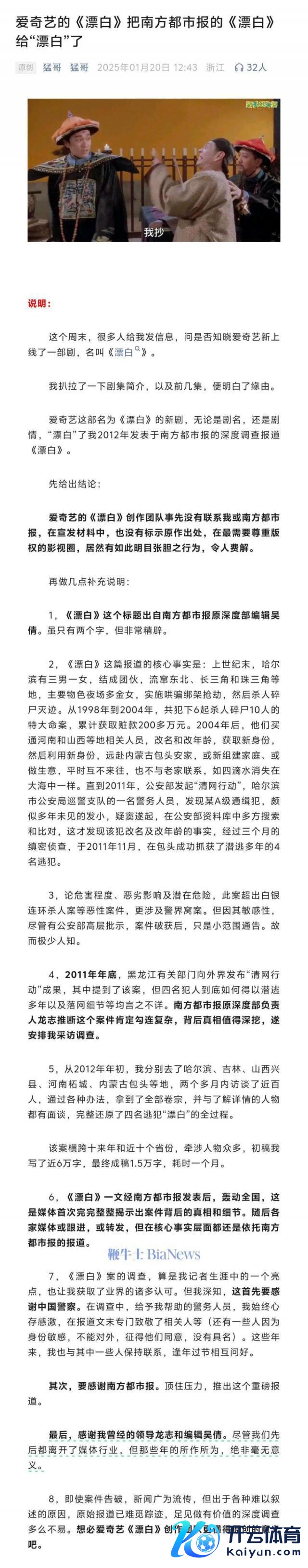 ZAKER 科技 1 月 21 日音讯 前探问记者、著名自媒体东说念主"猛哥"昨日在刊文称:爱奇艺的热播新剧《漂白》不管剧名仍是剧情,"漂白"了他 2012 年发表在供职媒体上的深度探问报说念。猛哥还示意,爱奇艺的《漂白》创作团队事前莫得联系他本东说念主或领有新闻作品版权的报社,在宣发材料中,也莫得标示原作出处。